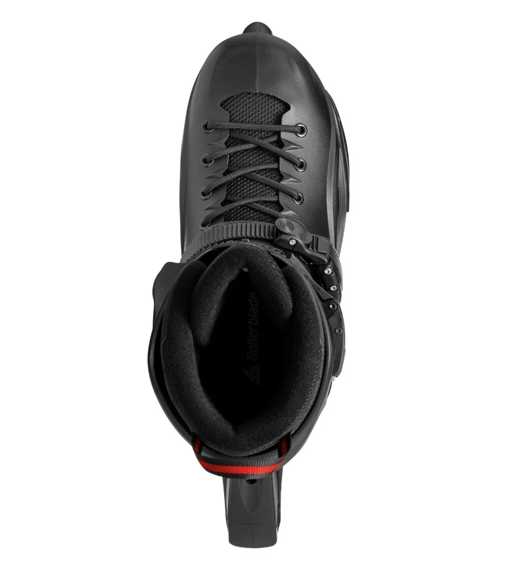 Le système de fermeture sécurisé, composé d’une boucle de manchette verrouillable, d’une boucle à 45° et de lacets, assure un ajustement précis et un maintien optimal du pied. Le frein est inclus et monté sur le patin pour plus de sécurité.